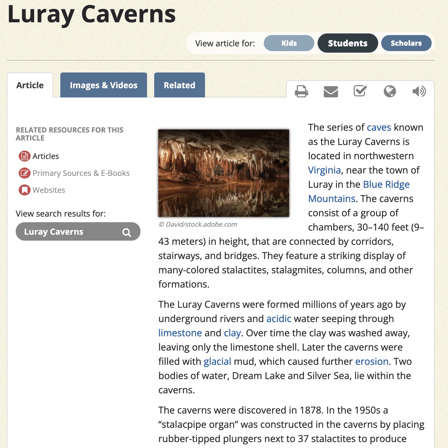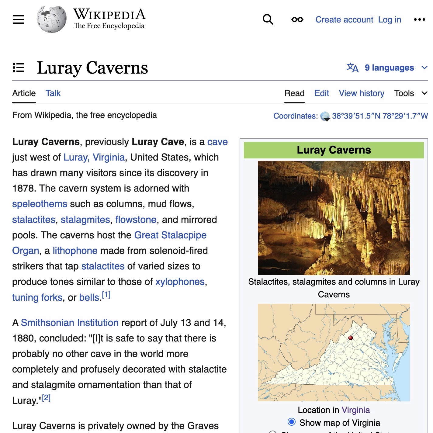 This is a 360 view inside Luray Caverns. Click the arrows to explore.